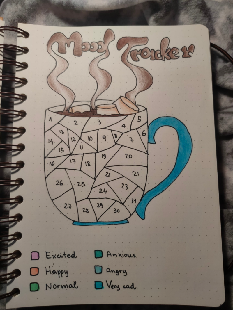 Per ultima ma non per importanza, anzi è la mia preferita: ho inserito l'ultima pagina che ho creato, ovviamente a stile cioccolata calda. Il disegno è diviso in 31 frammenti, i quali ciascuno rappresentano i giorni del mese. A seconda della legenda che ho riportato sotto, ogni giorno colorerò il singolo pezzo in base al mio umore. In modo da farmi, alla fine del mese, un'idea generale del mio umore durante esso. Il mood tracker, però, non è l'unico esistente di questa tipologia, per esempio abbiamo lo sleep tracker e il water tracker.
